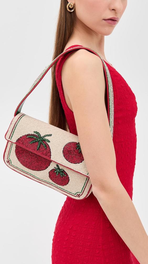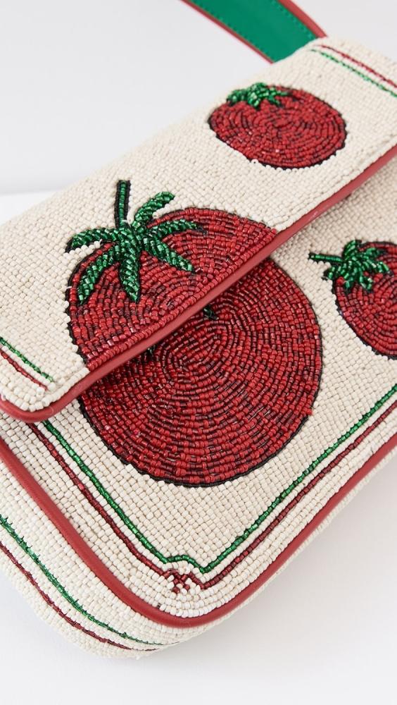 مطرزة بالخرز باللون الابيض مع رسومات طماطم واسباغتي من الخلف مستوحاه من ايطاليا ، حجم متوسط يناسب احتياجاتك اليومية ( ايفون ، عطر، محفظة، مفاتيح، مكياجك اليومي)