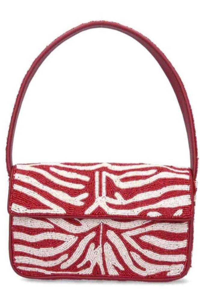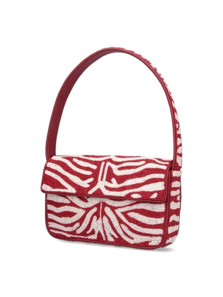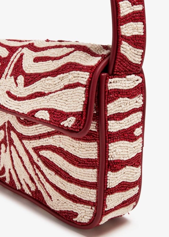 مطرزة بالخرز باللون الاحمر على نمط خطوط ، حجم متوسط يناسب احتياجاتك اليومية ( ايفون ، عطر، محفظة، مفاتيح، مكياجك اليومي)