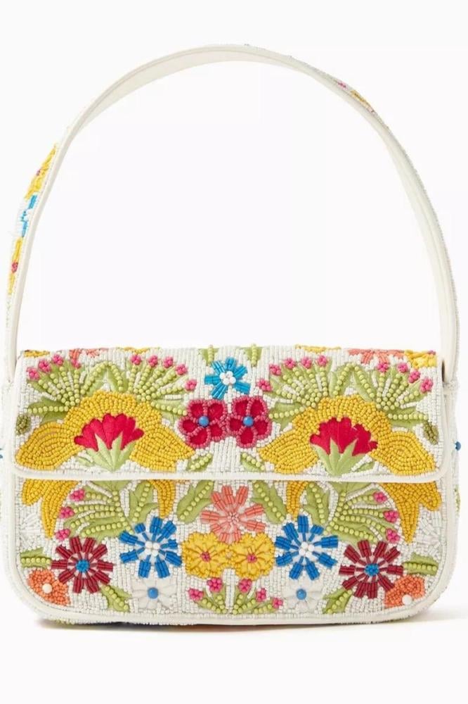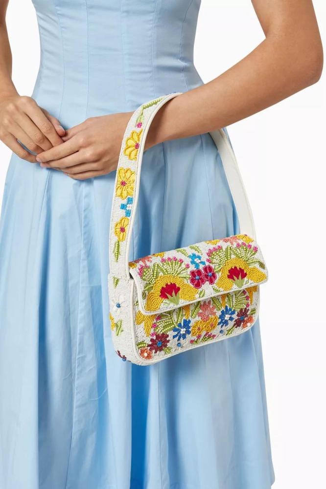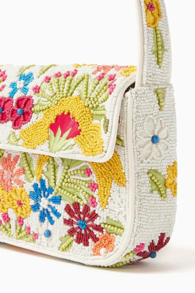 Embroidered with white beads with colorful flower designs, medium size to fit your daily needs (iPhone, perfume, wallet, keys, your daily makeup)